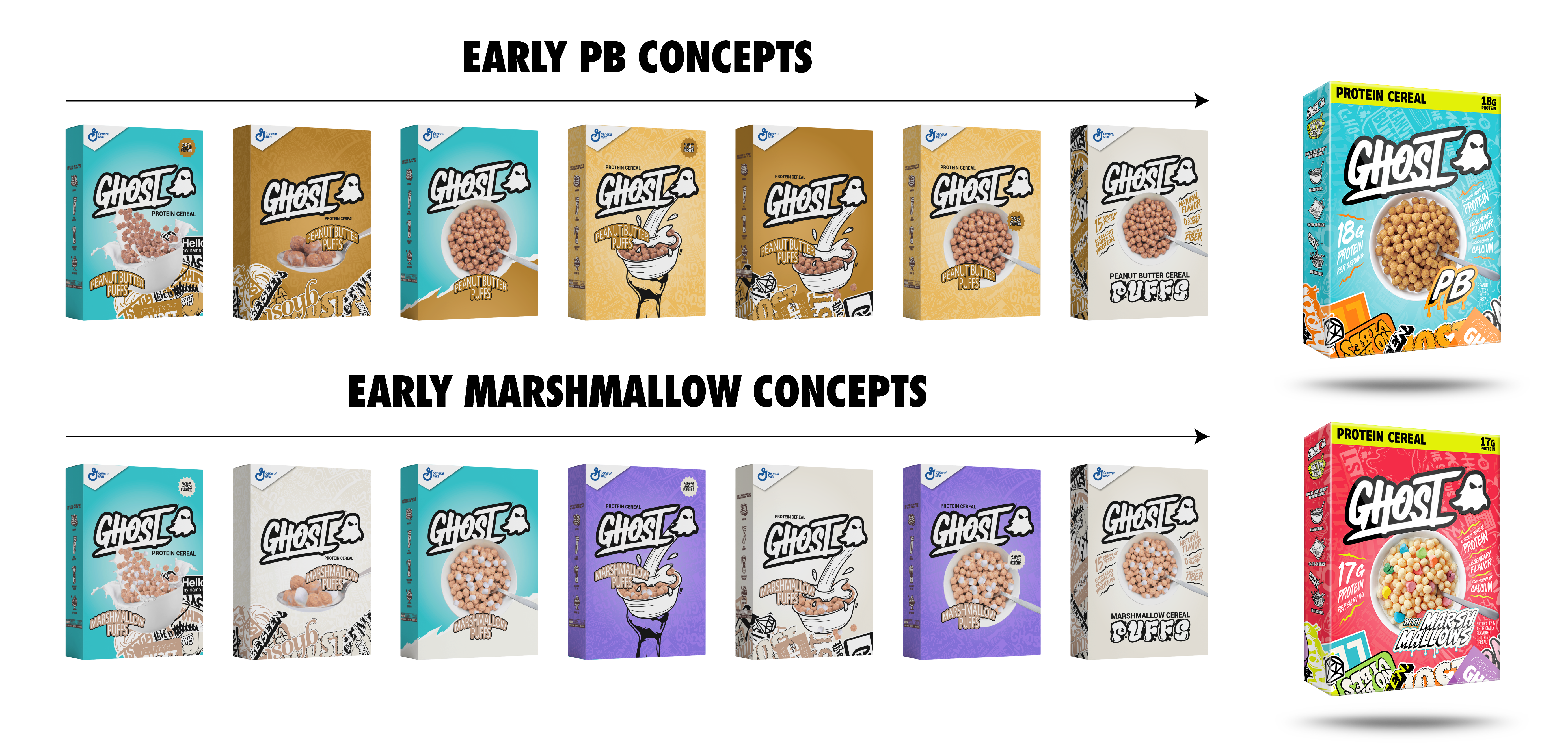 A design that merges the GHOST brand with collab General Mills flavors.